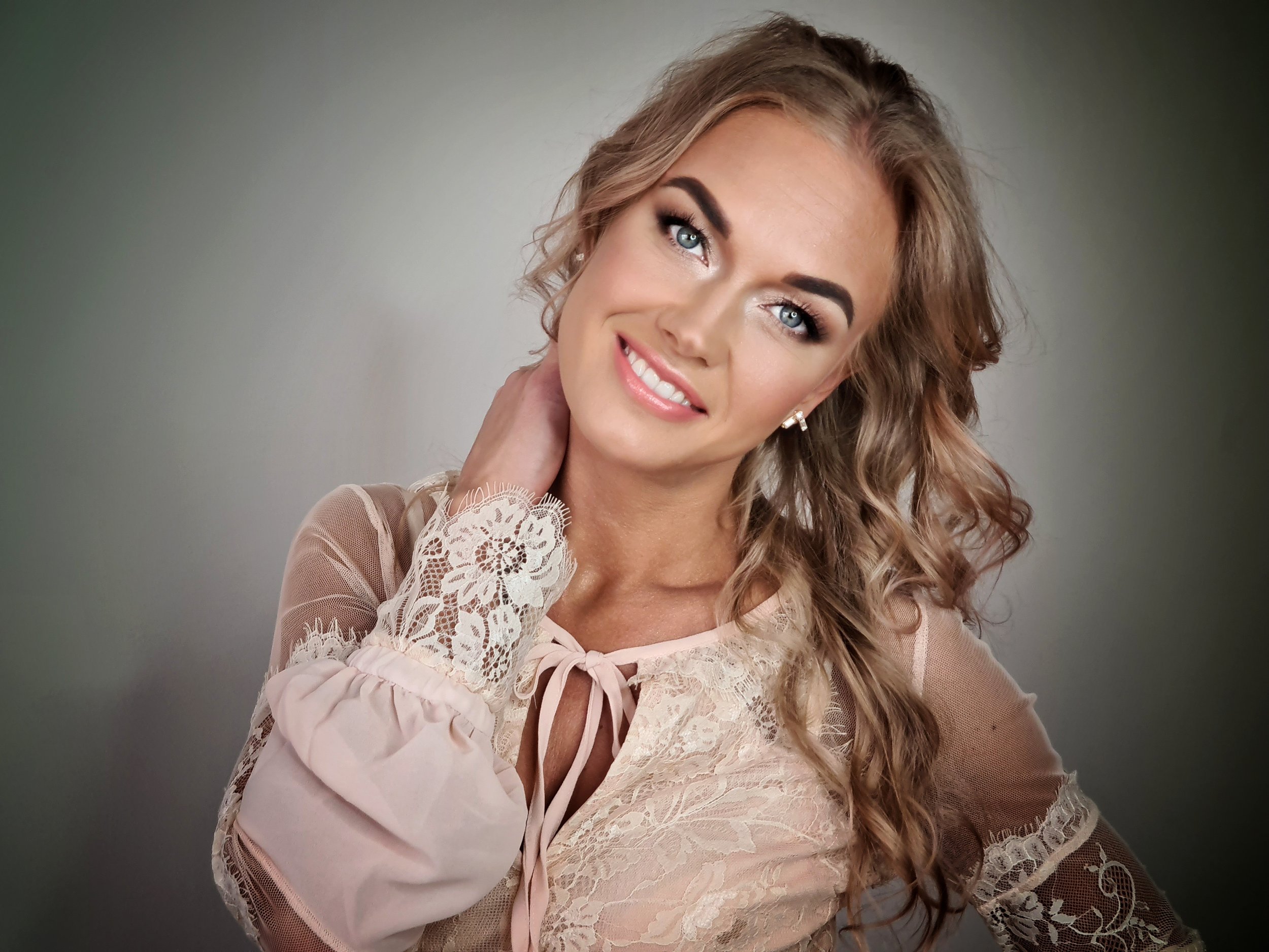 A young woman with wavy blonde hair and blue eyes looking at the camera, wearing a black leather jacket, a chunky necklace, and multiple rings, sitting on a chair with a neutral background.
