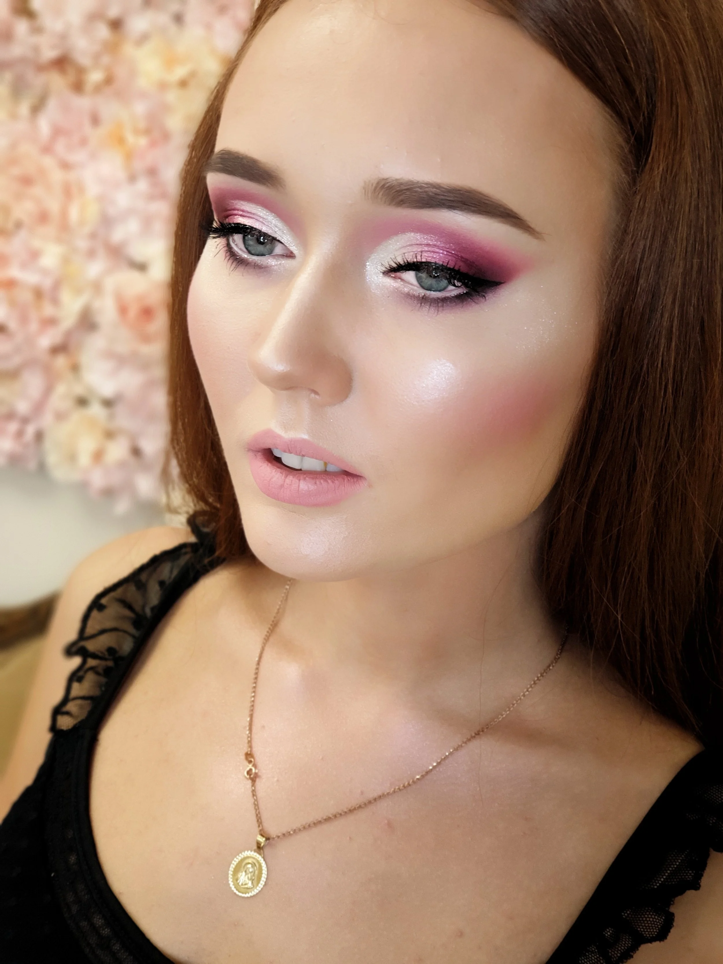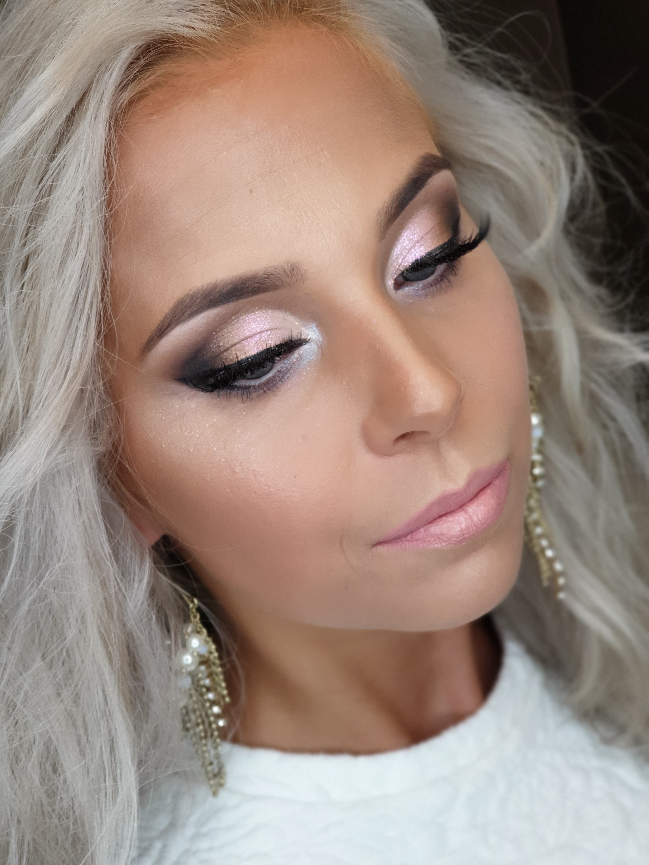Close-up of a woman's face with creative eye makeup and pearls, resting her head on her arm with a reflective surface below.